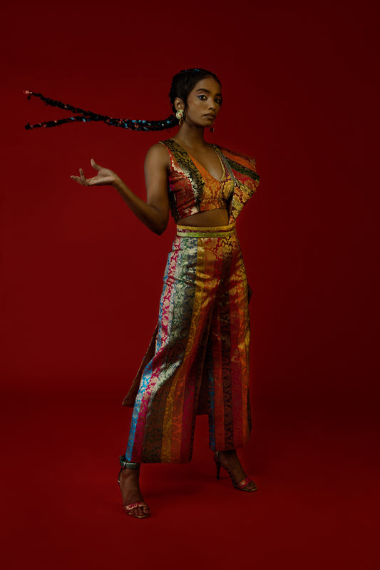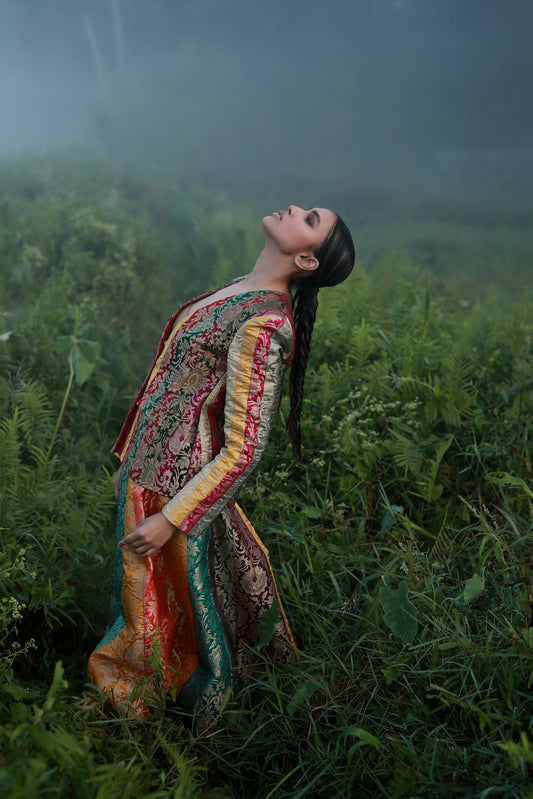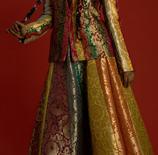 When we received a bulk order for banarasi lehengas in a variety of colours, we knew we would have a ton of scrap fabrics left over. Not wanting to waste these beautiful trims and scraps, we decided to make a multi-hued collection featuring modern silhouettes perfect for your pre-wedding rituals.