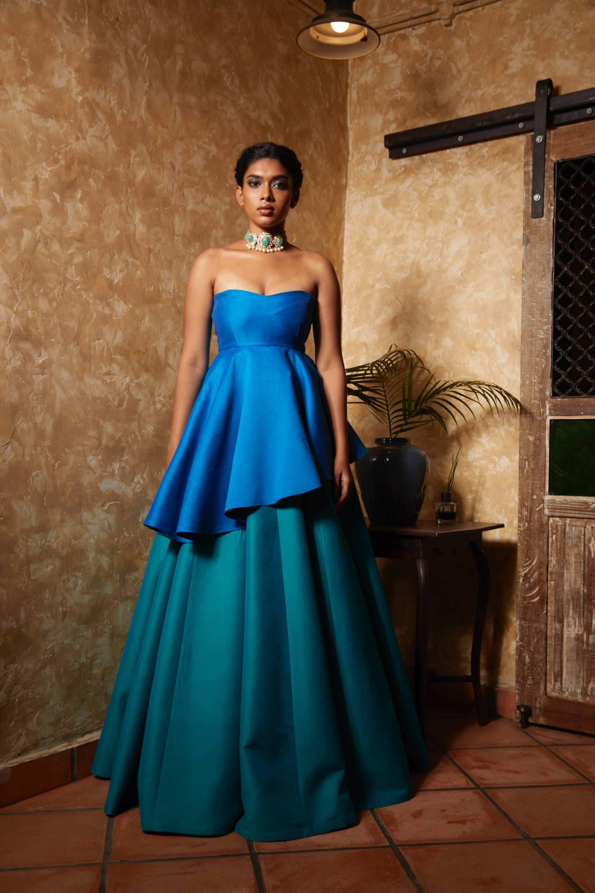 A strapless layered gown crafted in luxurious dual-tone raw silk for a bold yet graceful presence. Featuring a structured silhouette and a concealed zip at the back, this design blends timeless elegance with contemporary flair.