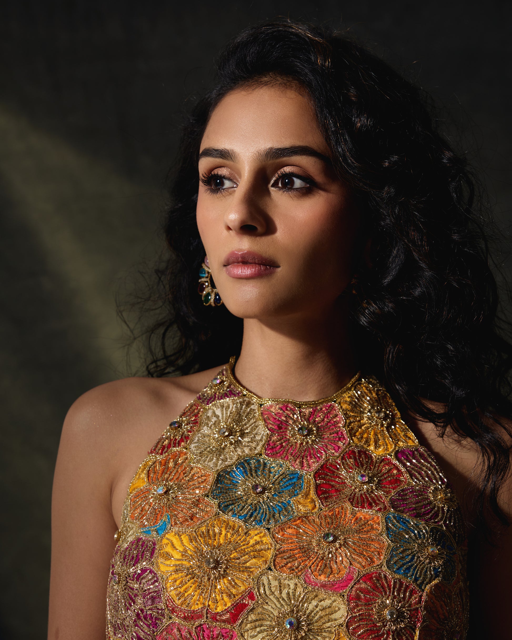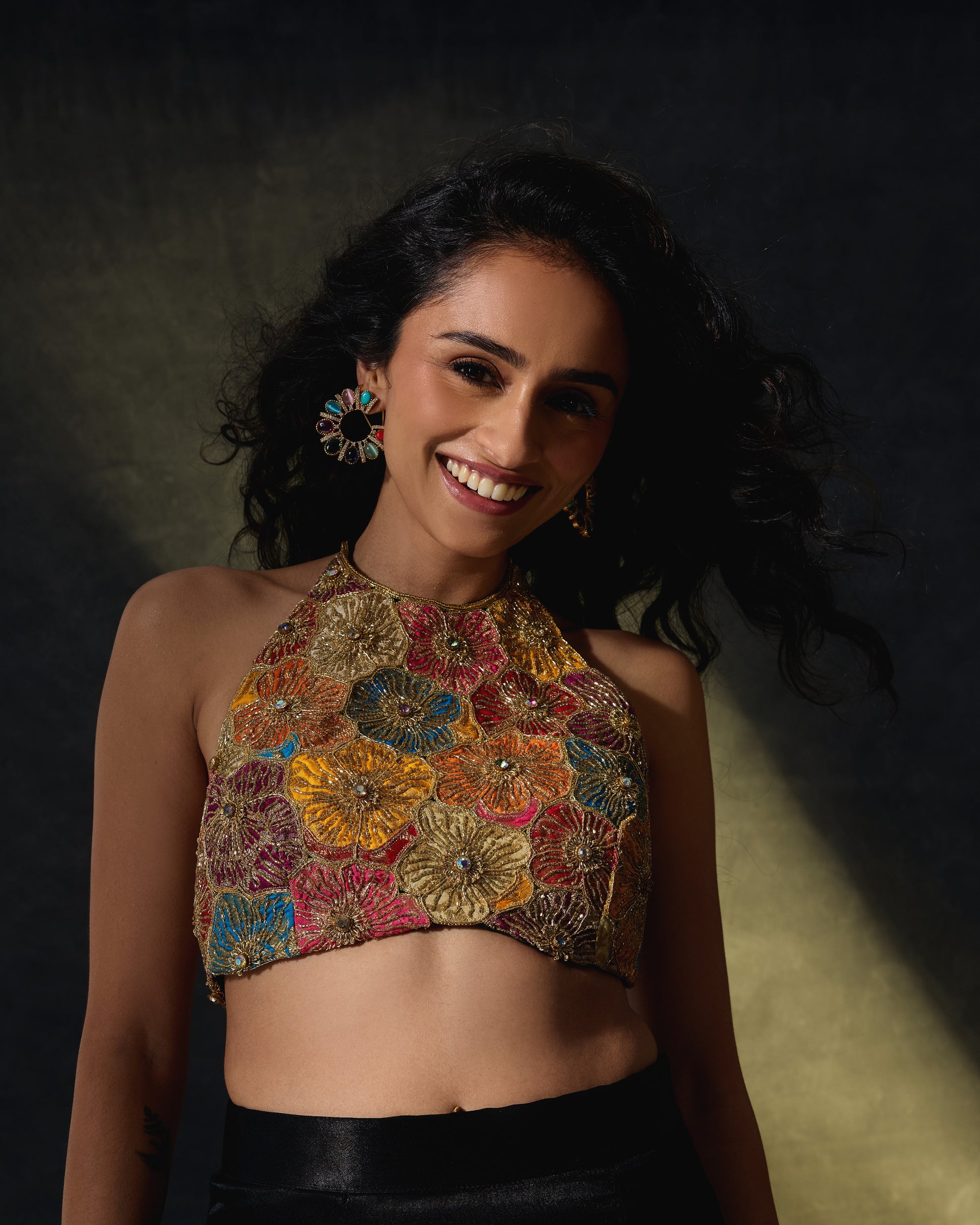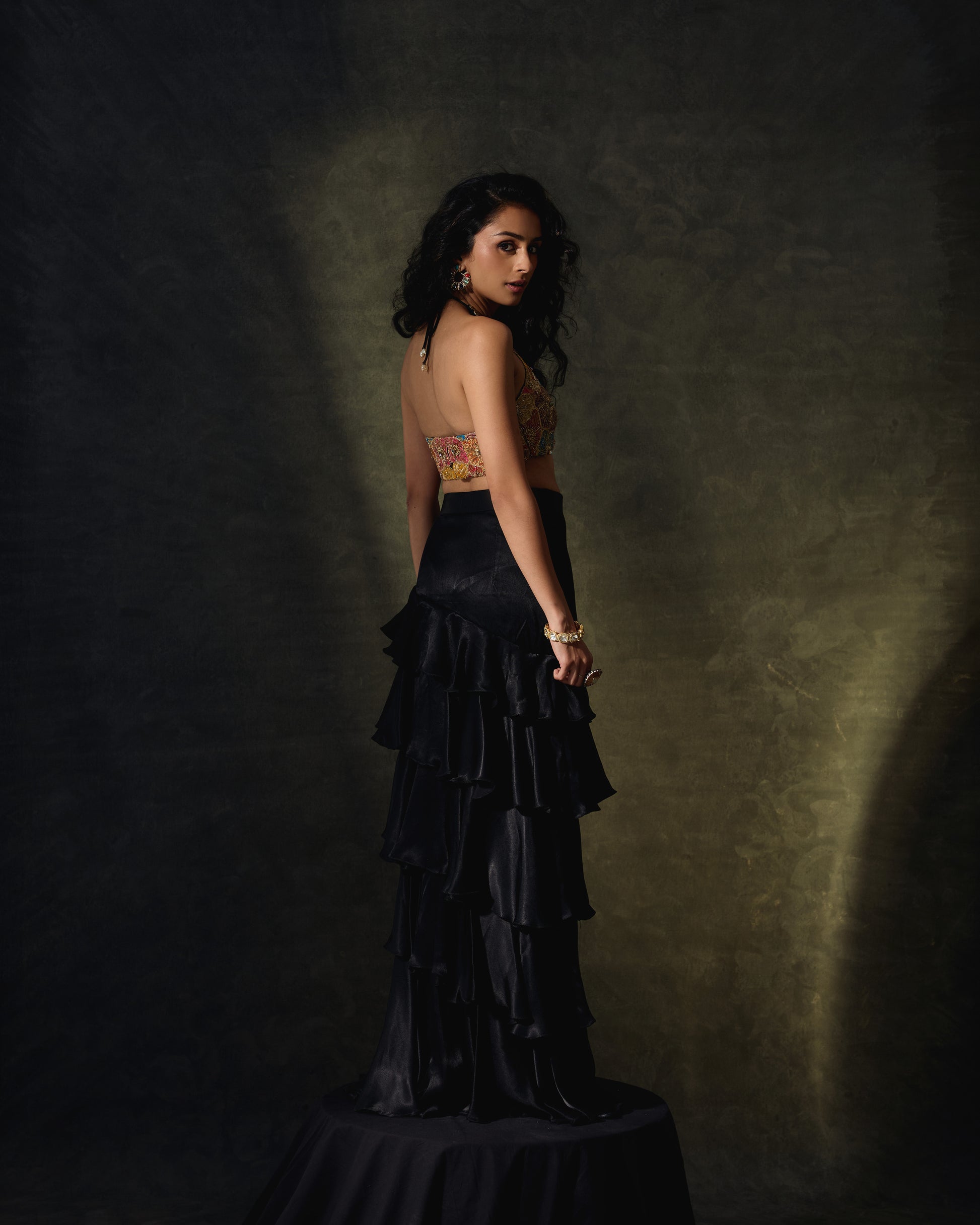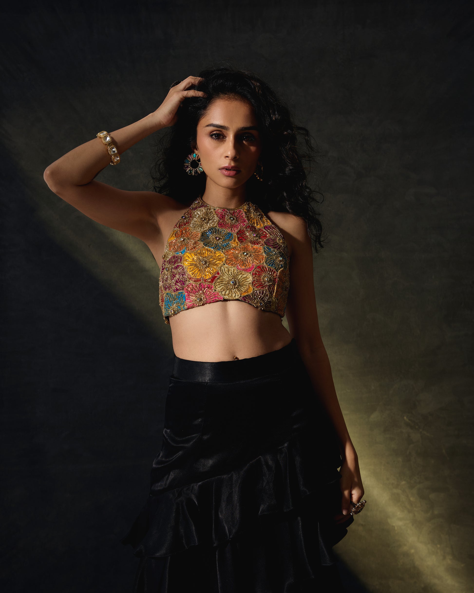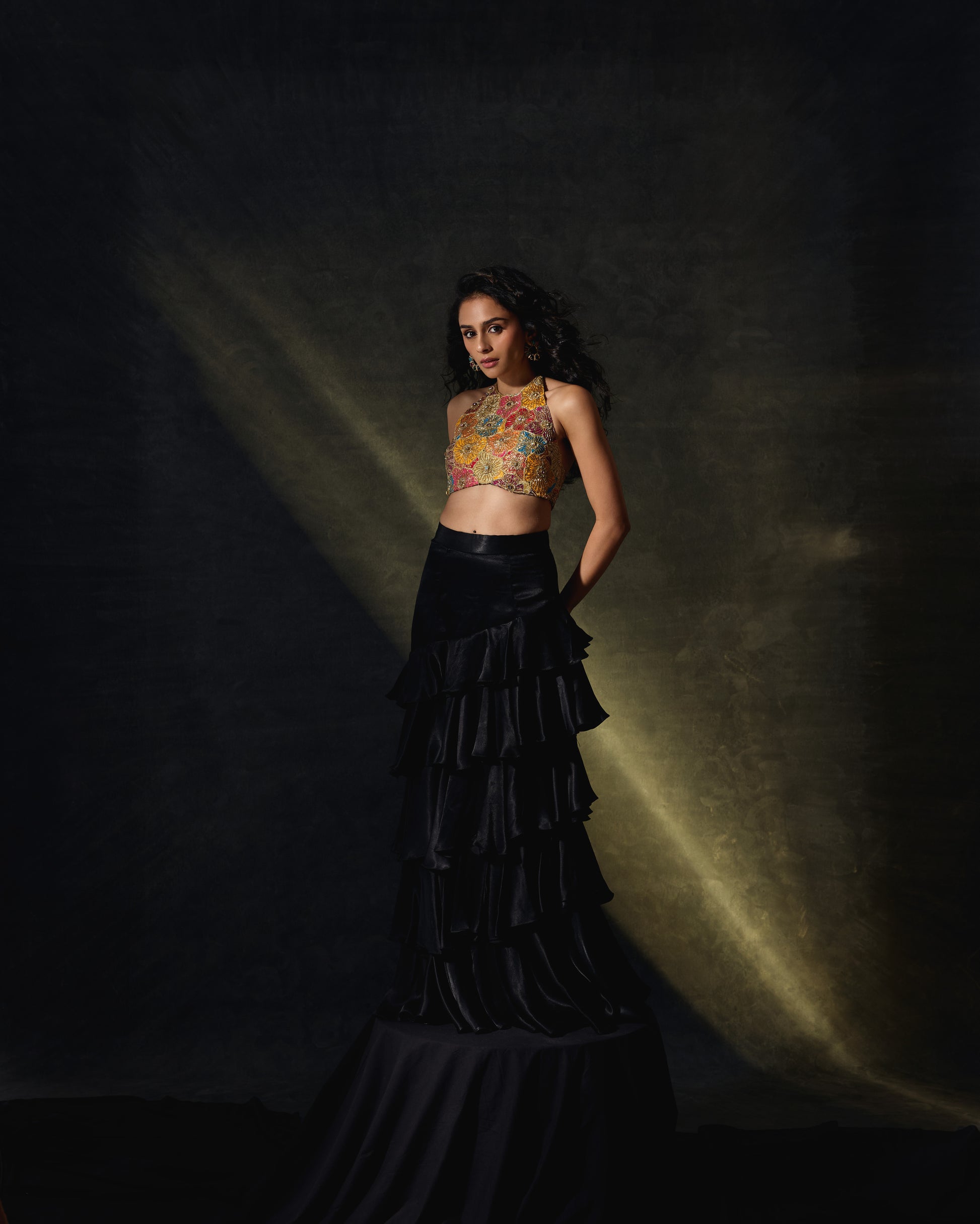 Cascada features a halter neck top that is covered in bright embellished flowers, upcycled from house staple Banarasi brocade fabrics. It is paired with a black satin skirt that is put together using layers of asymmetrical ruffles creating the cascading effect of a waterfall. Besides the full look, just the halter top is available for purchase too.