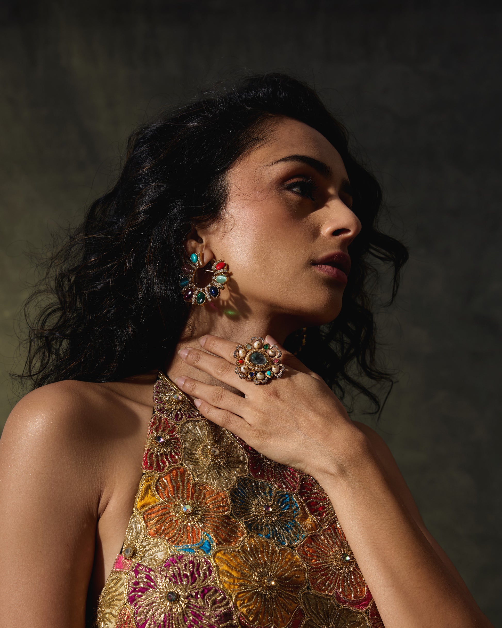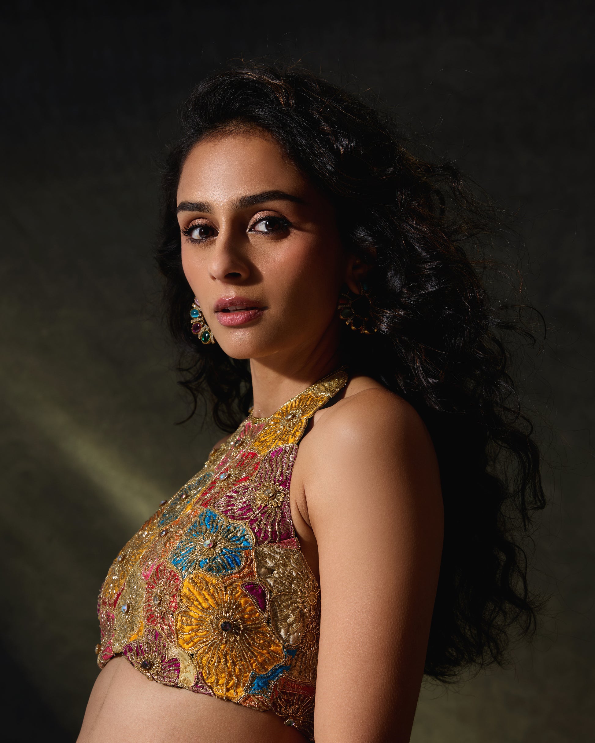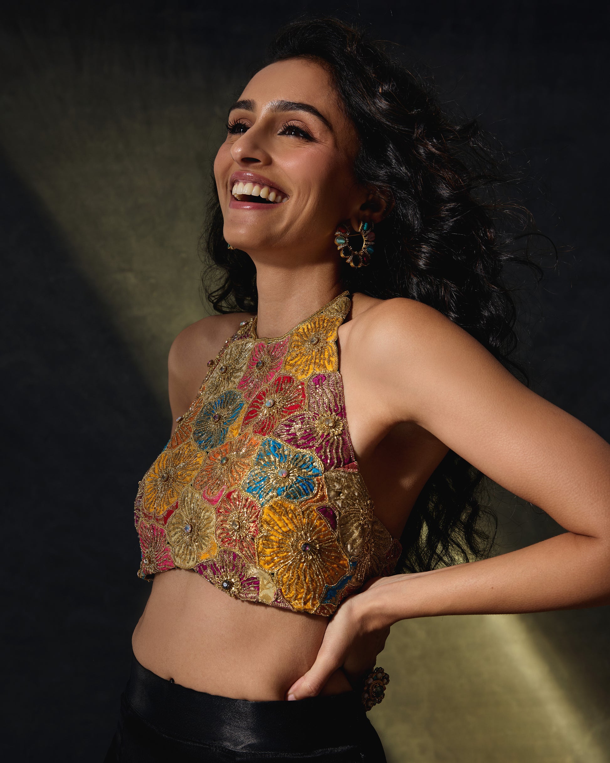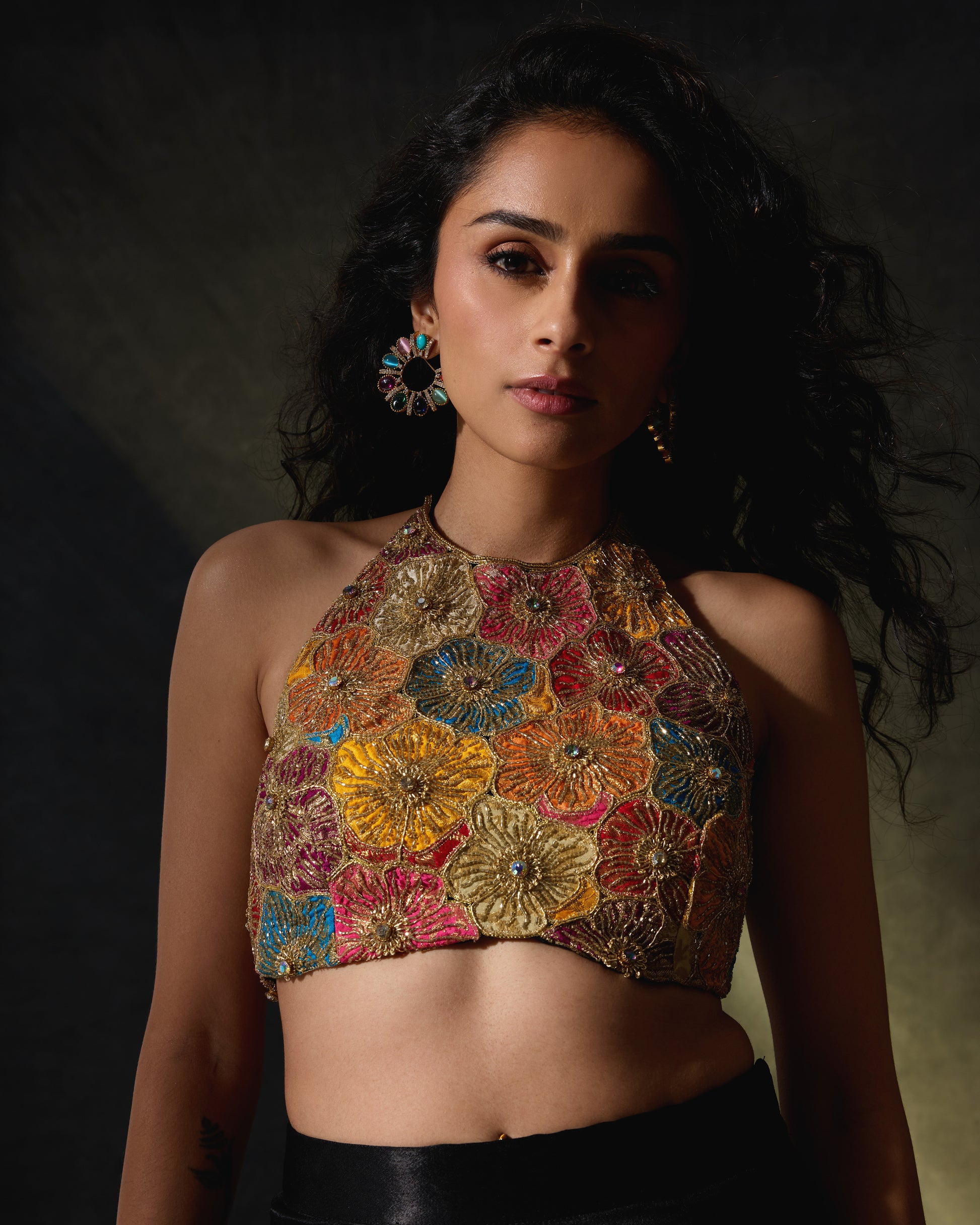 Cascada features a halter neck top that is covered in bright embellished flowers, upcycled from house staple Banarasi brocade fabrics. Bugle bead and zari embroidery add beautiful sparkles to this floral top.