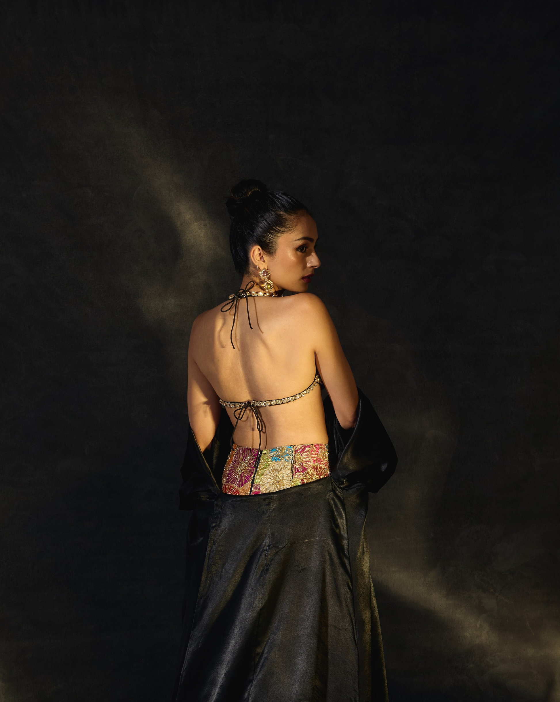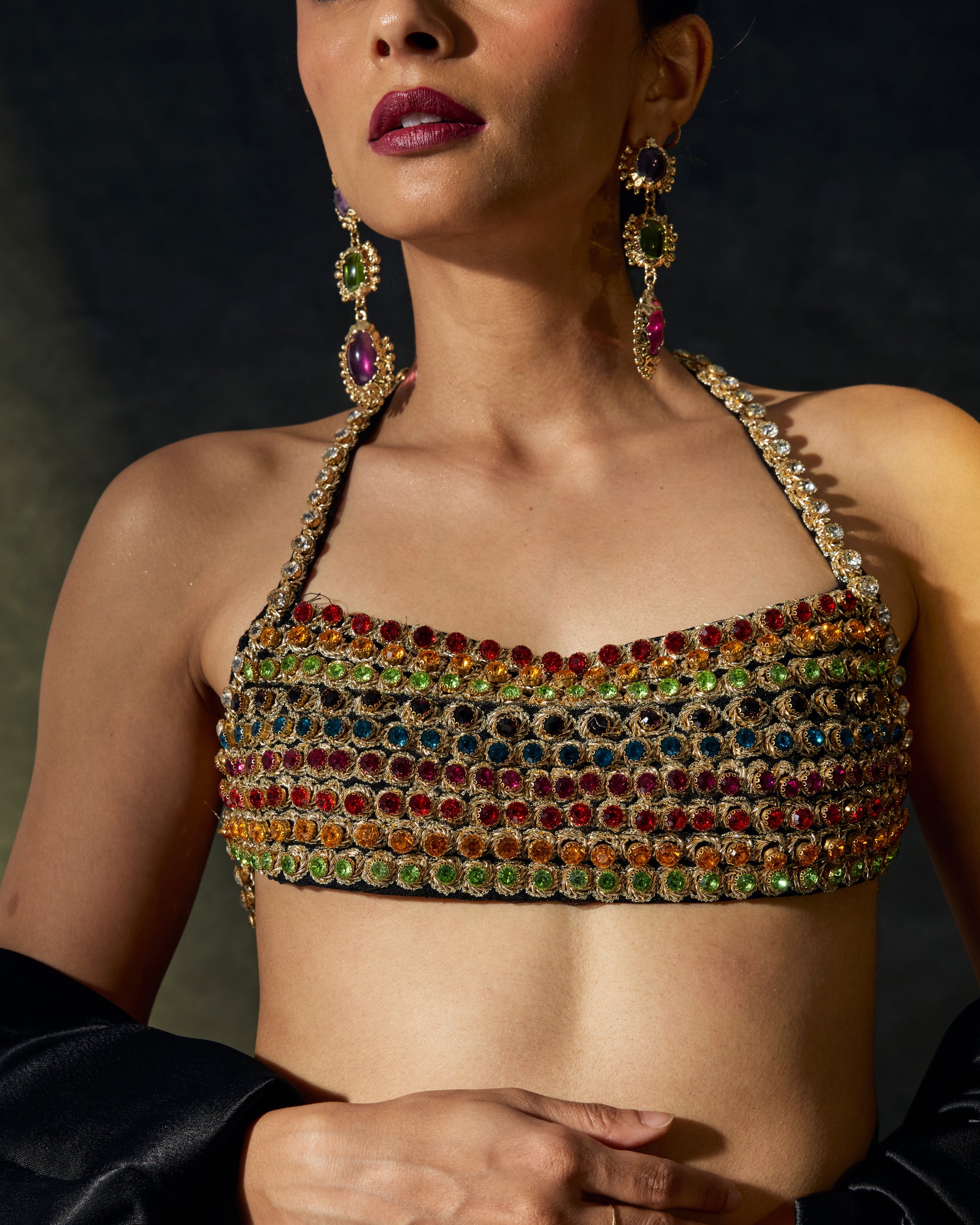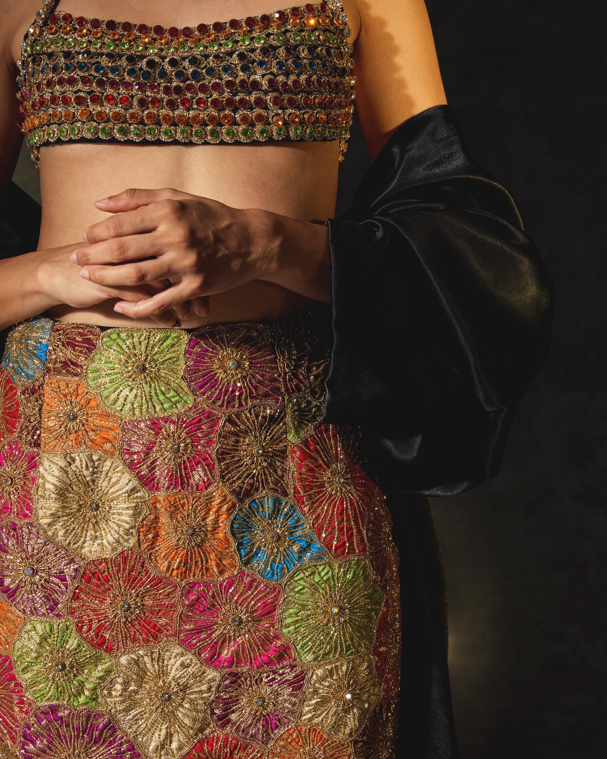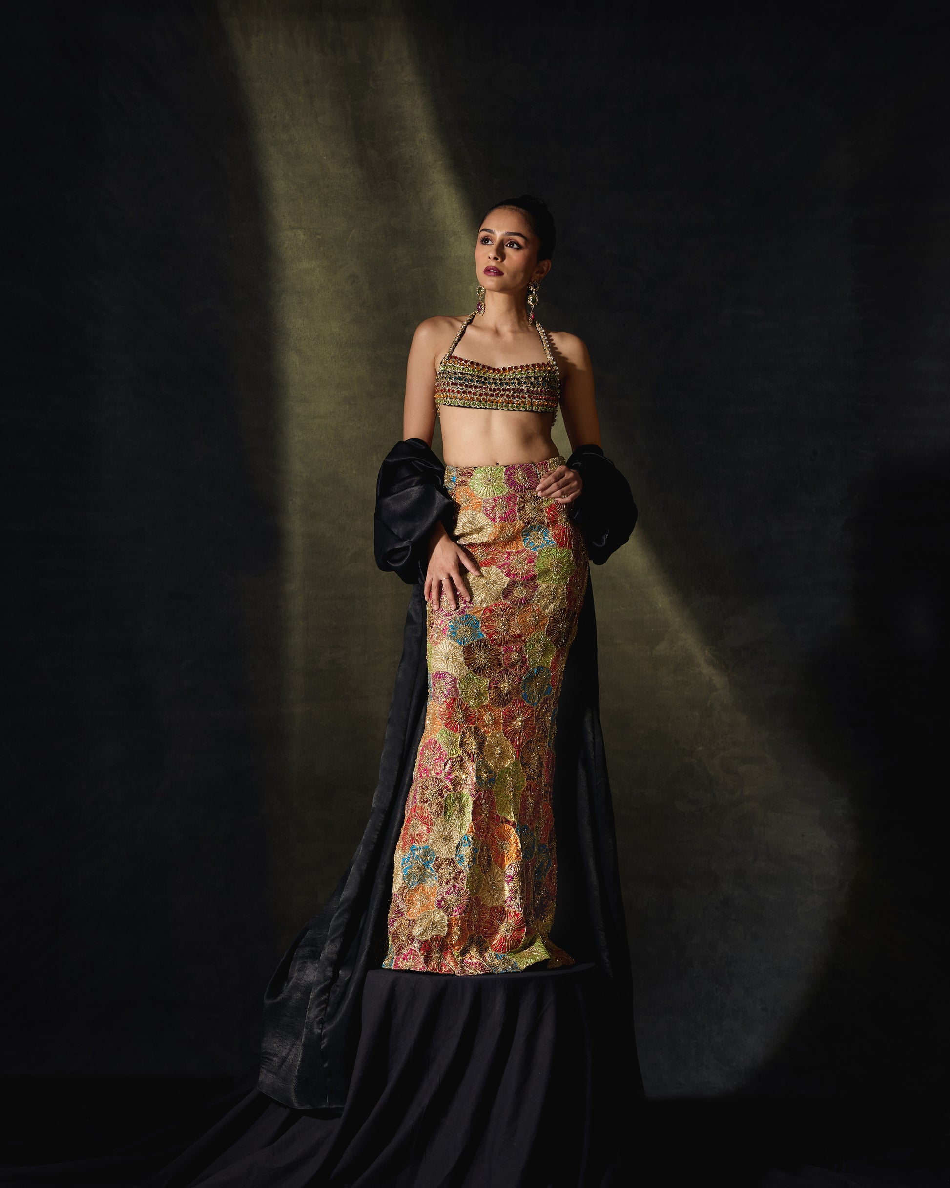 Elysium refers to the paradise beyond Eden. This other-worldly ensemble is comprised of three beautiful pieces. More than a hundred stones surrounded by intricate zardozi work come together to make this statement bejeweled top. The mermaid style skirt is completely upcycled, constructed with hundreds of embellished banarasi brocade flowers and adorned with bugle beads all around. A long black satin cape with oversized sleeves is the perfect complementary completion to this otherwise brightly coloured look.