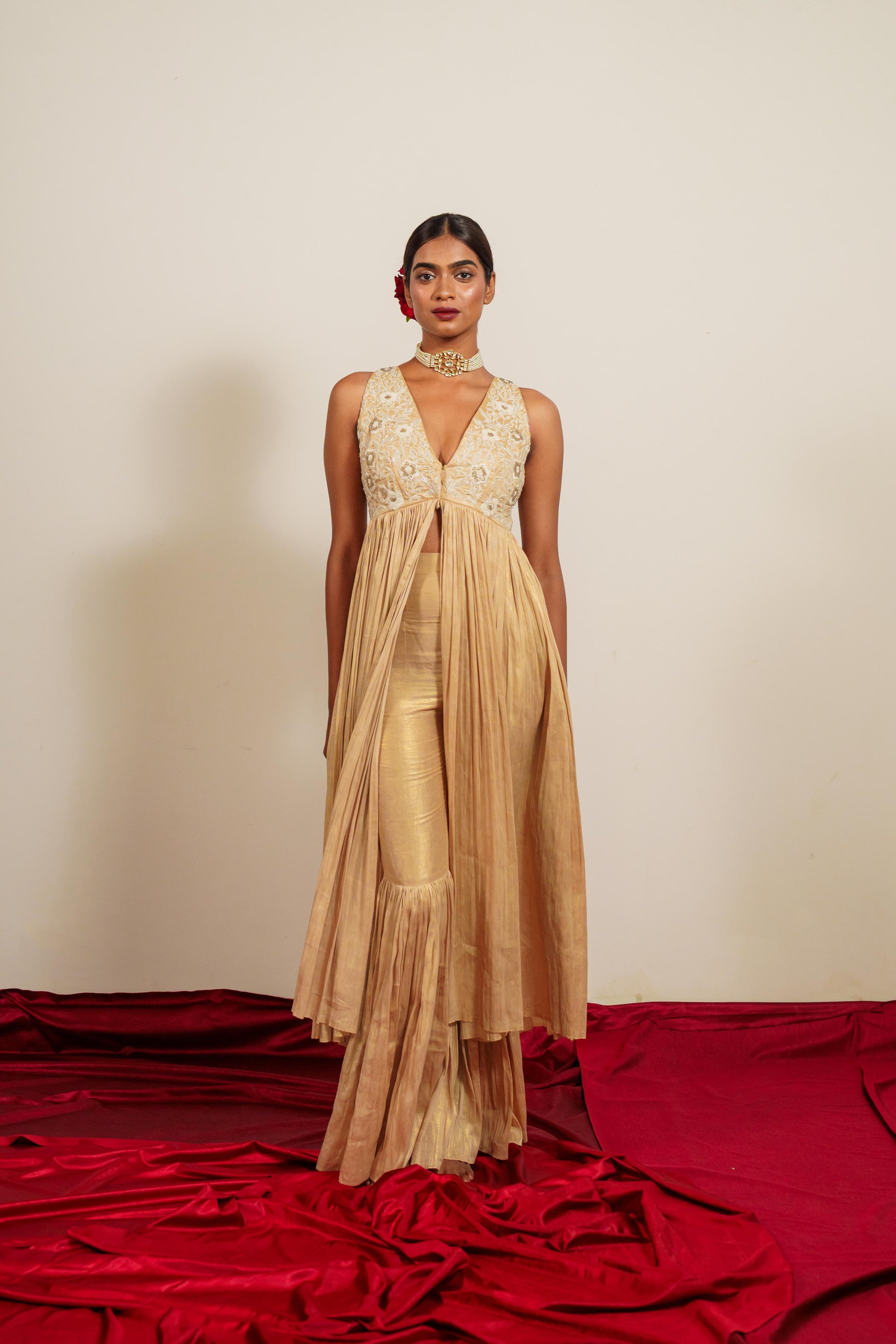A Tunic style gathered jacket featuring an embroidered bodice paired with Gharara inspired high waisted pants. This dress features a sharp yet flowy silhouette, blending structure with graceful movement.