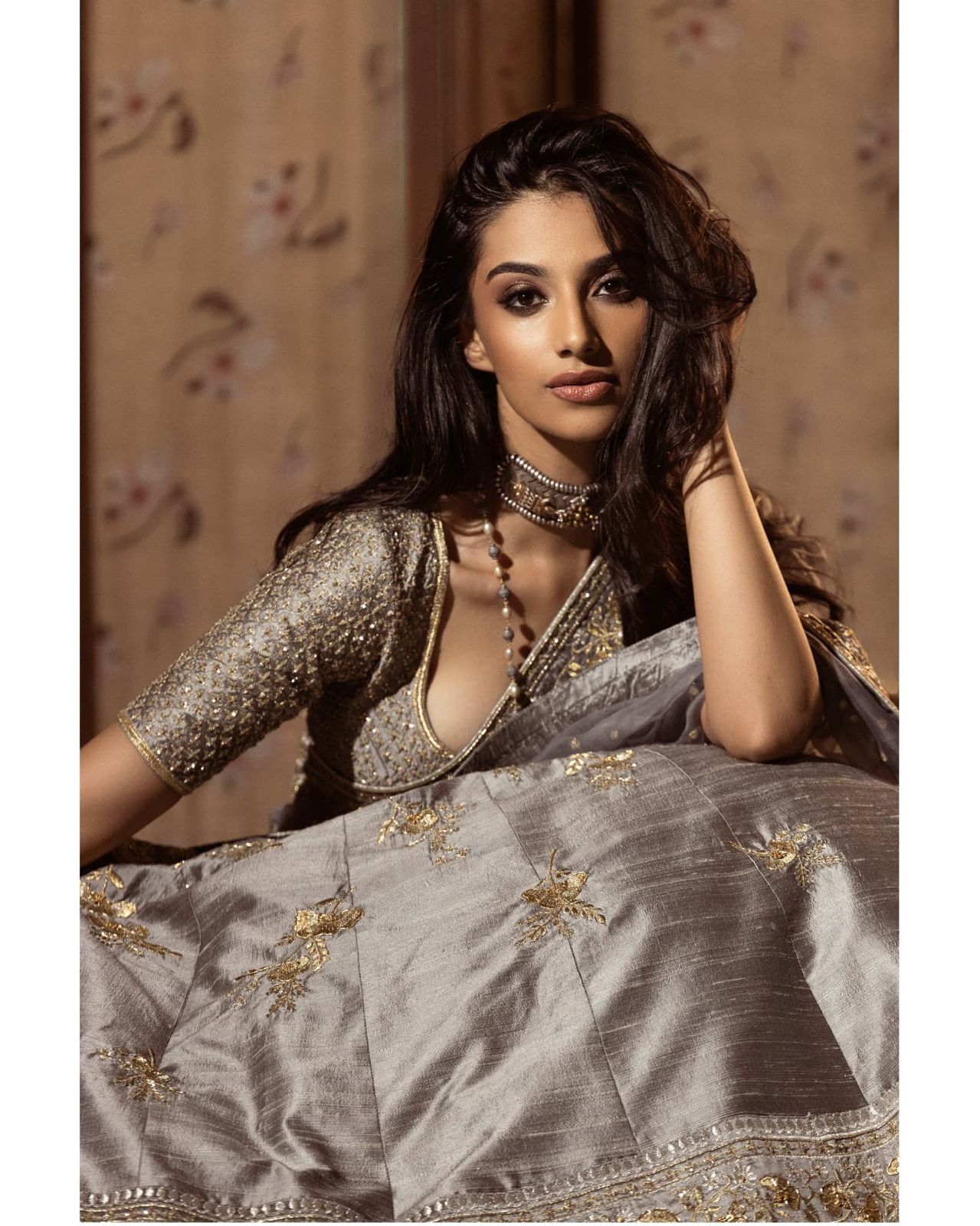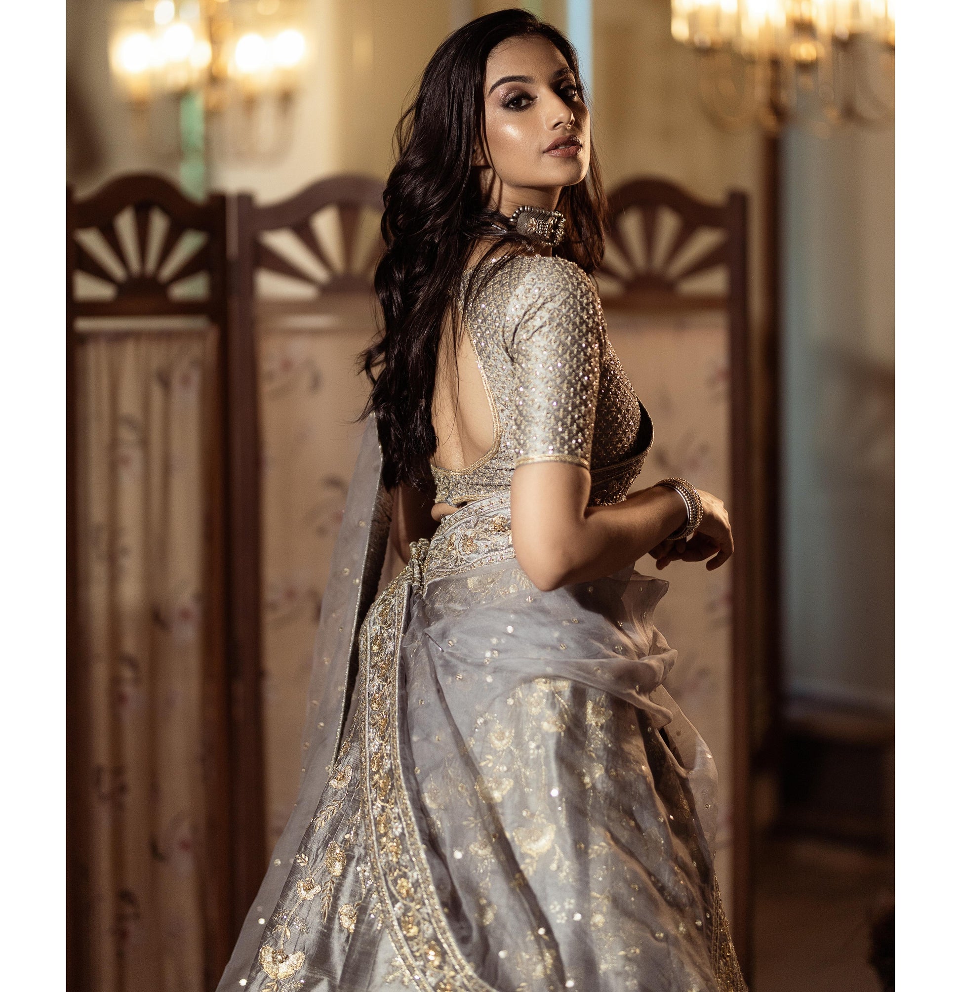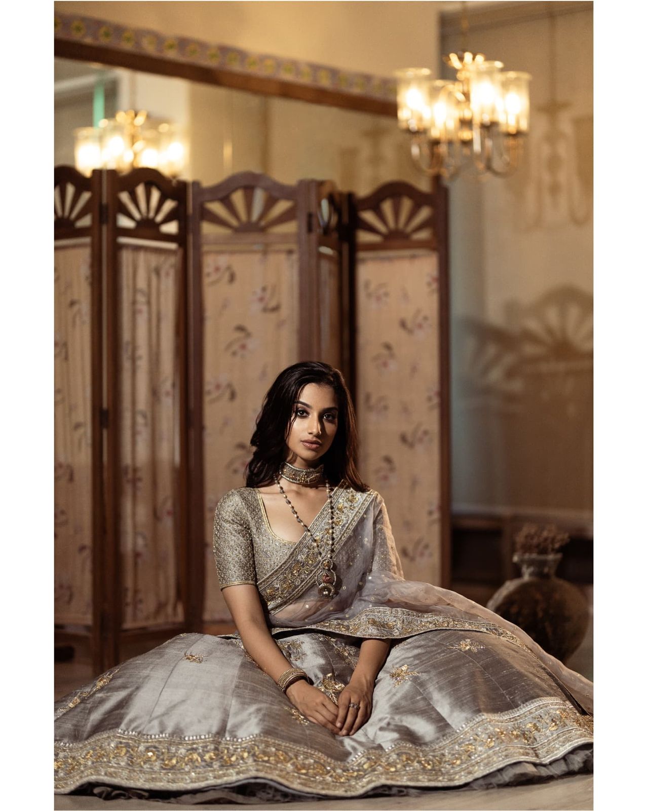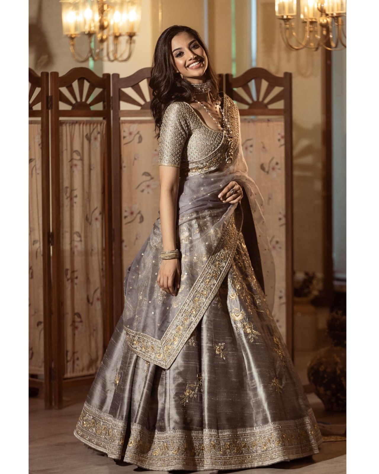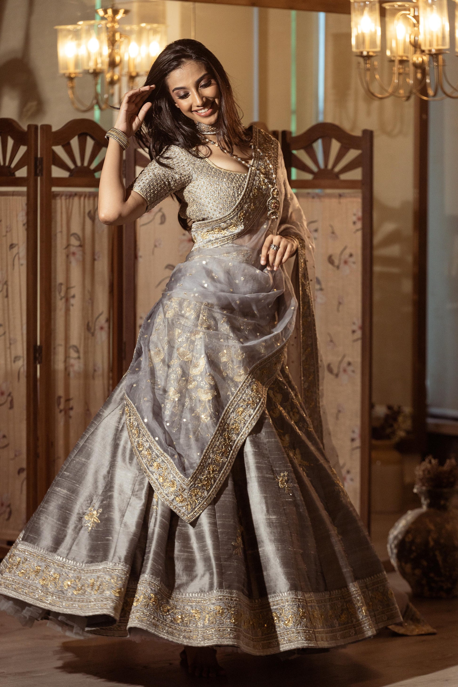This grey raw silk lehenga exudes elegance as it features intricate gold and silver dual-tone embroidery. The shimmering metallic threads create a harmonious contrast, adding a touch of opulence while maintaining a refined, sophisticated appeal.