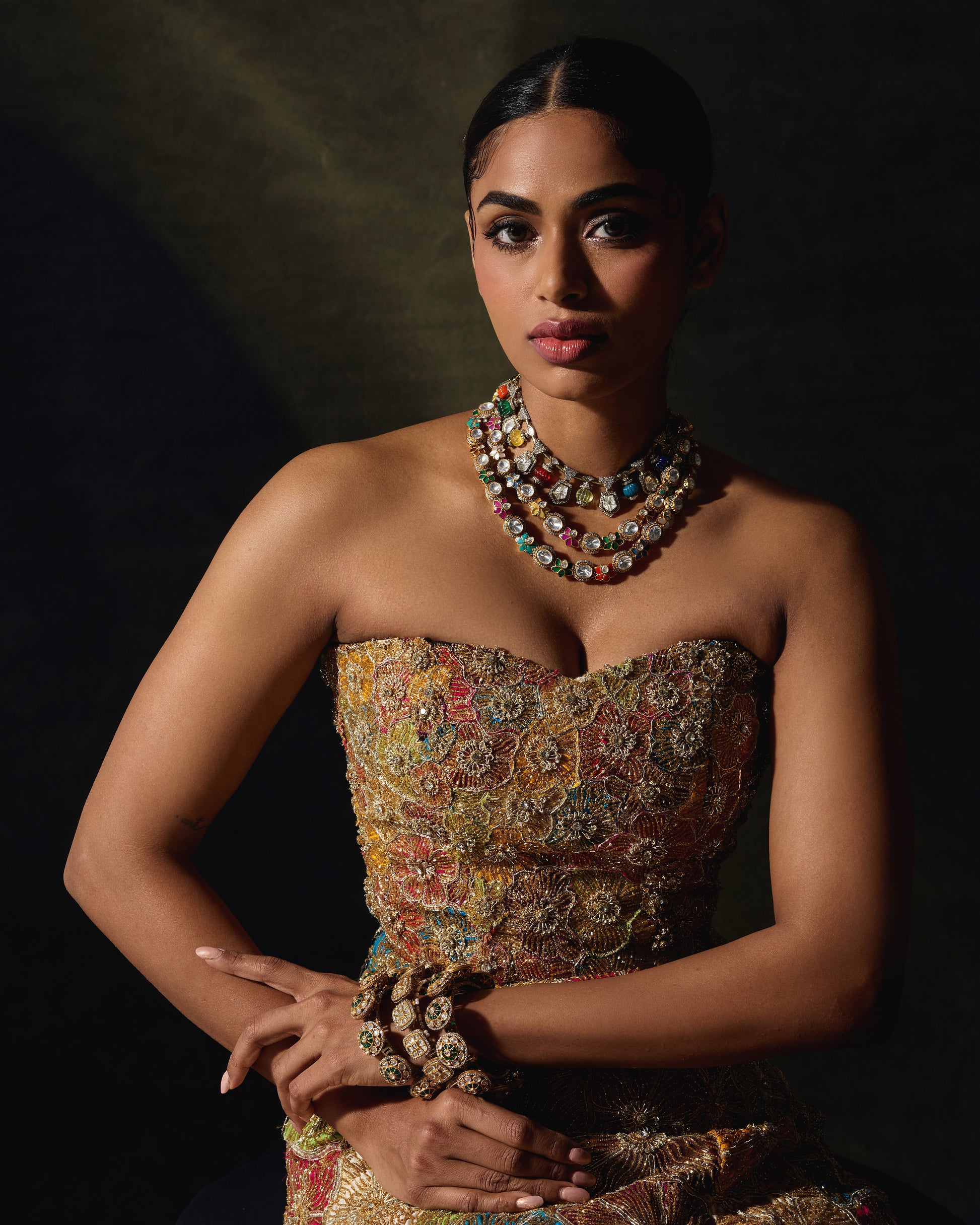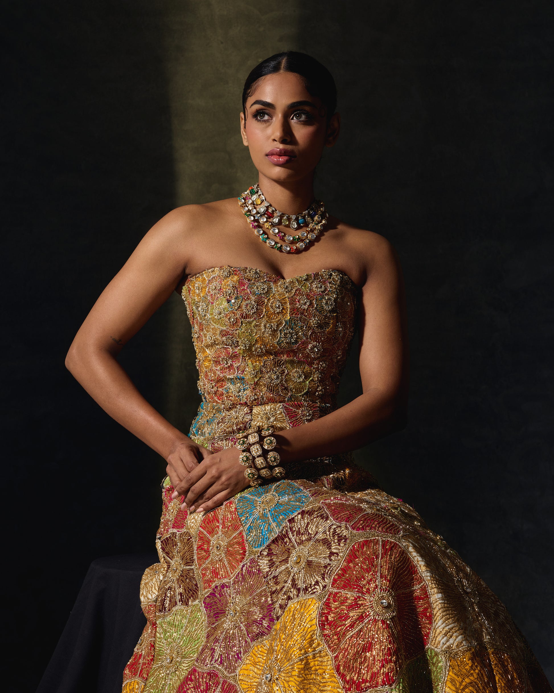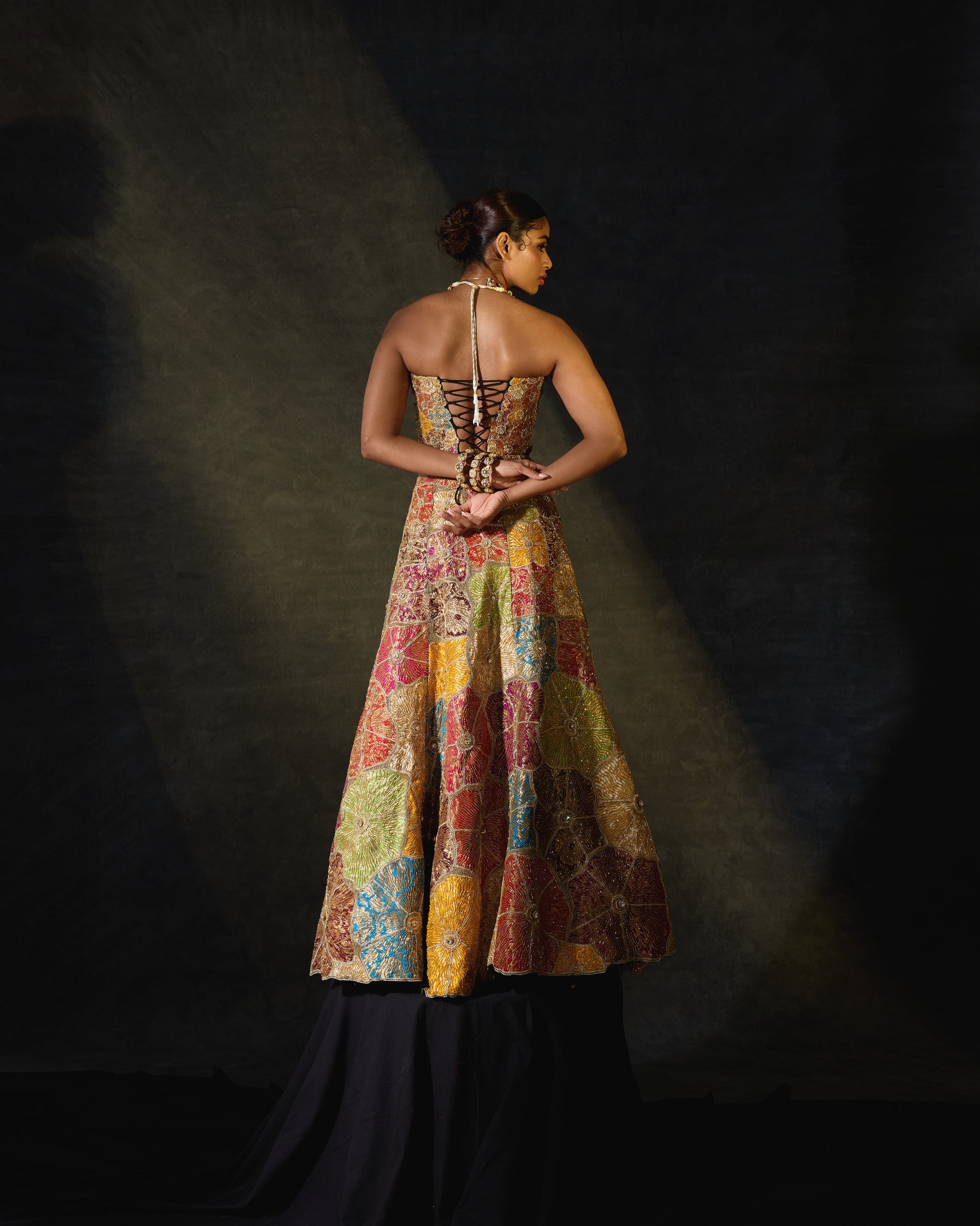 Jardin is the crescendo of the Eden collection. It is everything that the house stands for - fully upcycled, a seamless blend of tradition and contemporary aesthetic and a sheer celebration of colour. Hundreds of manual hours were spent to create this corset, made entirely of Banarasi brocade flowers. Each flower is detailed with veins and outlines of bugle beads, and further bejeweled with a multitude of crystal stones. Every colour of the spectrum finds it's home in this ensemble and the sparkles are simply infinite.