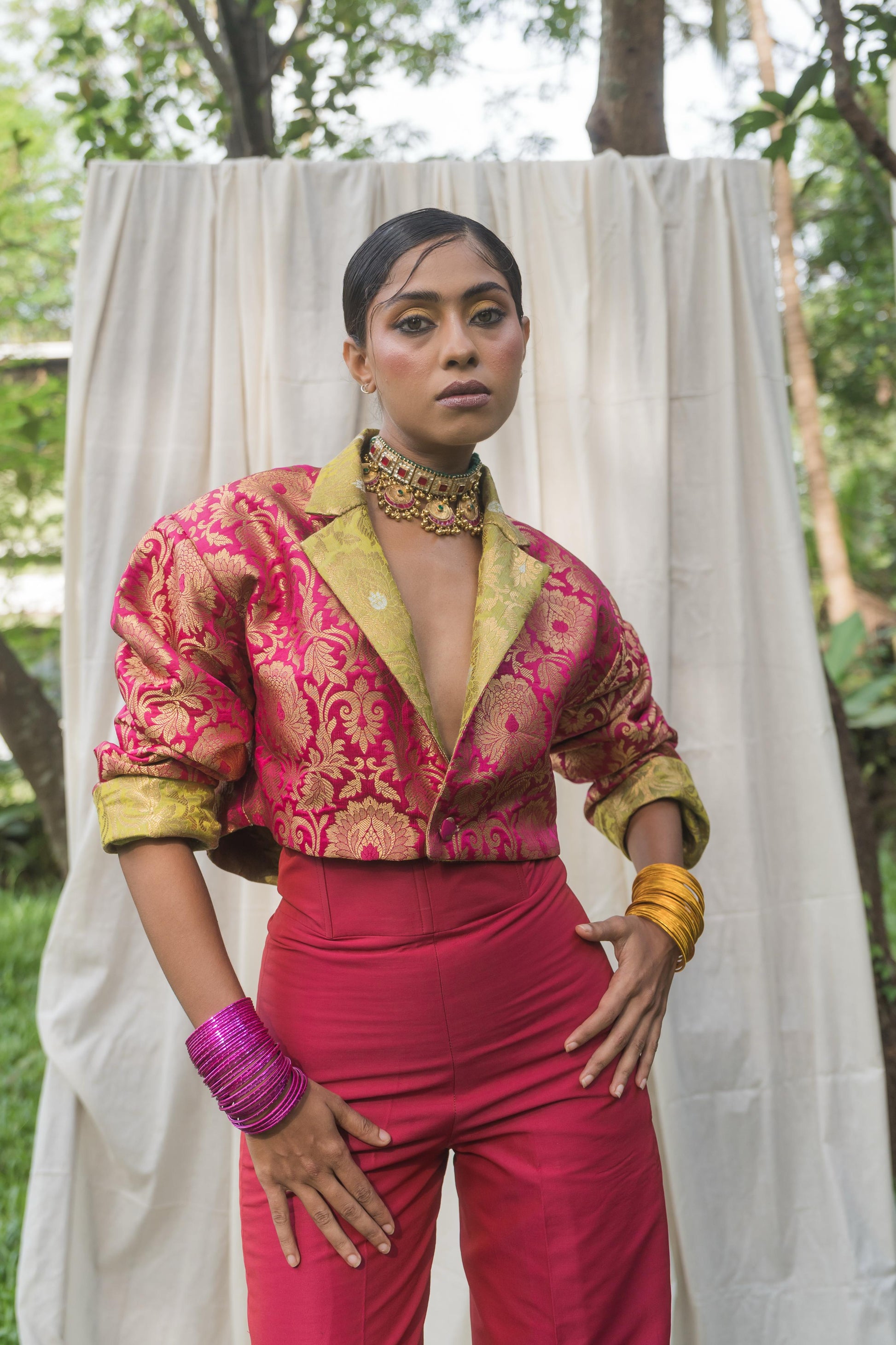 A two tone reversible cropped jacket paired with corseted pants.Traditional fabric meets a bold, modern silhouette—where heritage gets a contemporary twist.