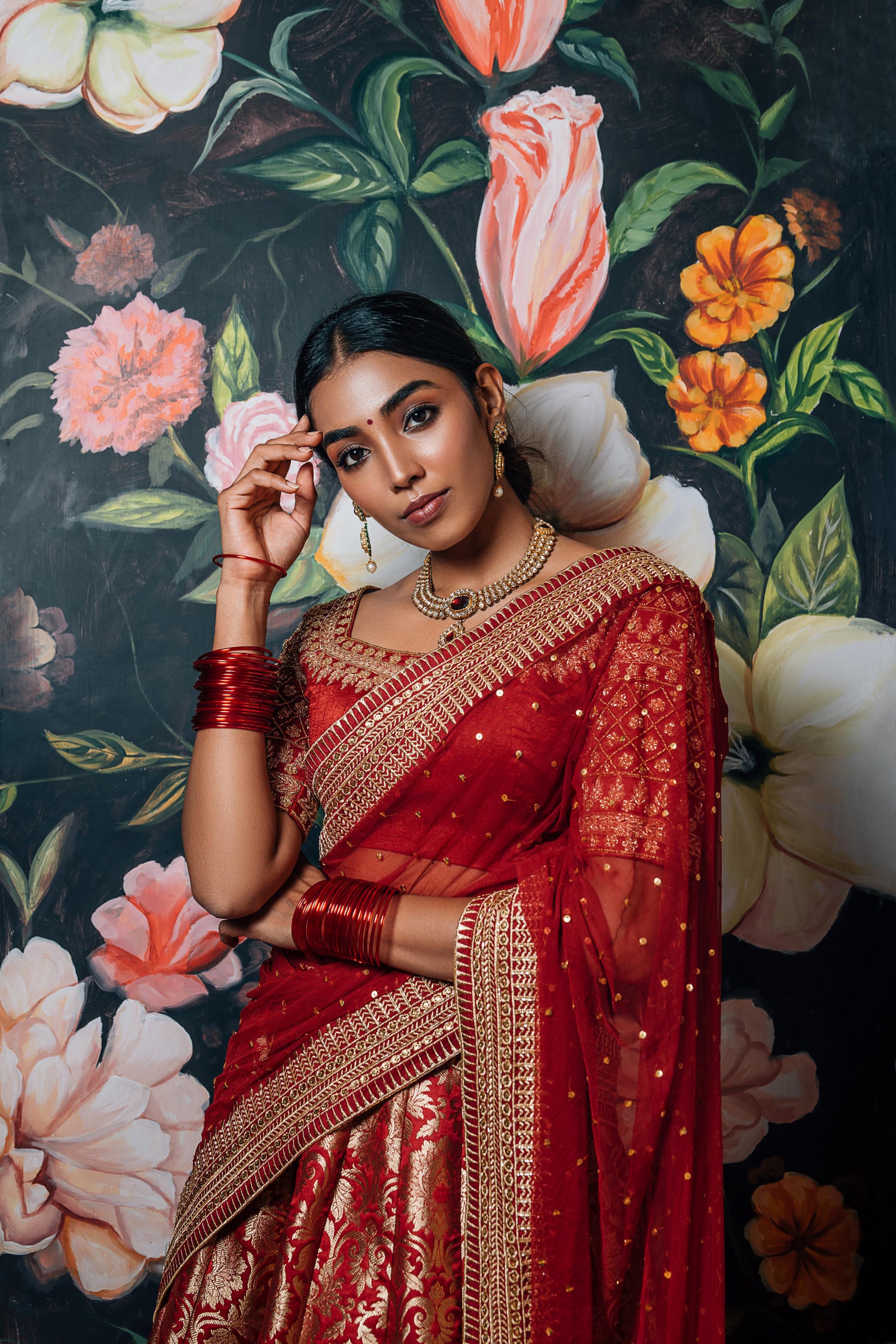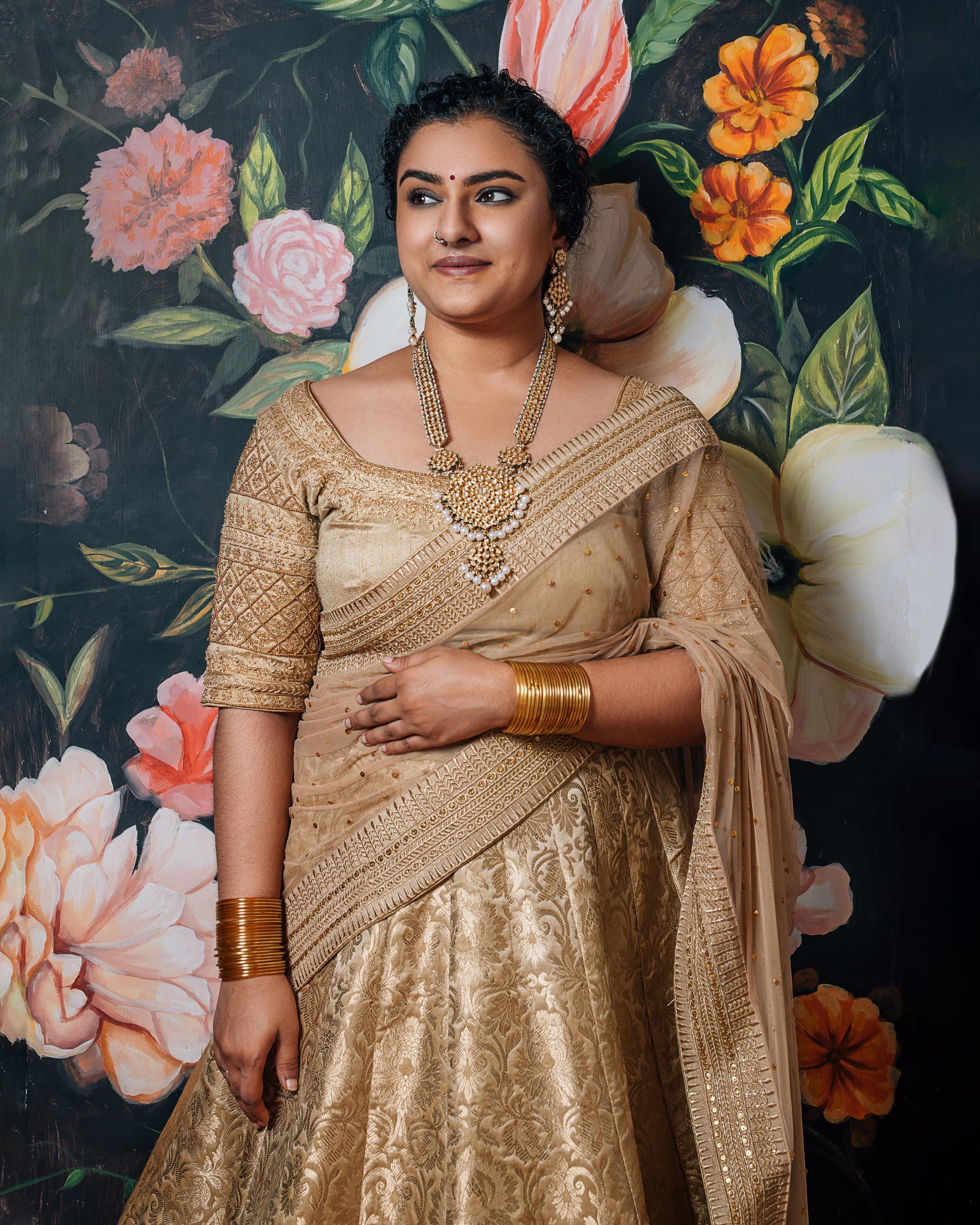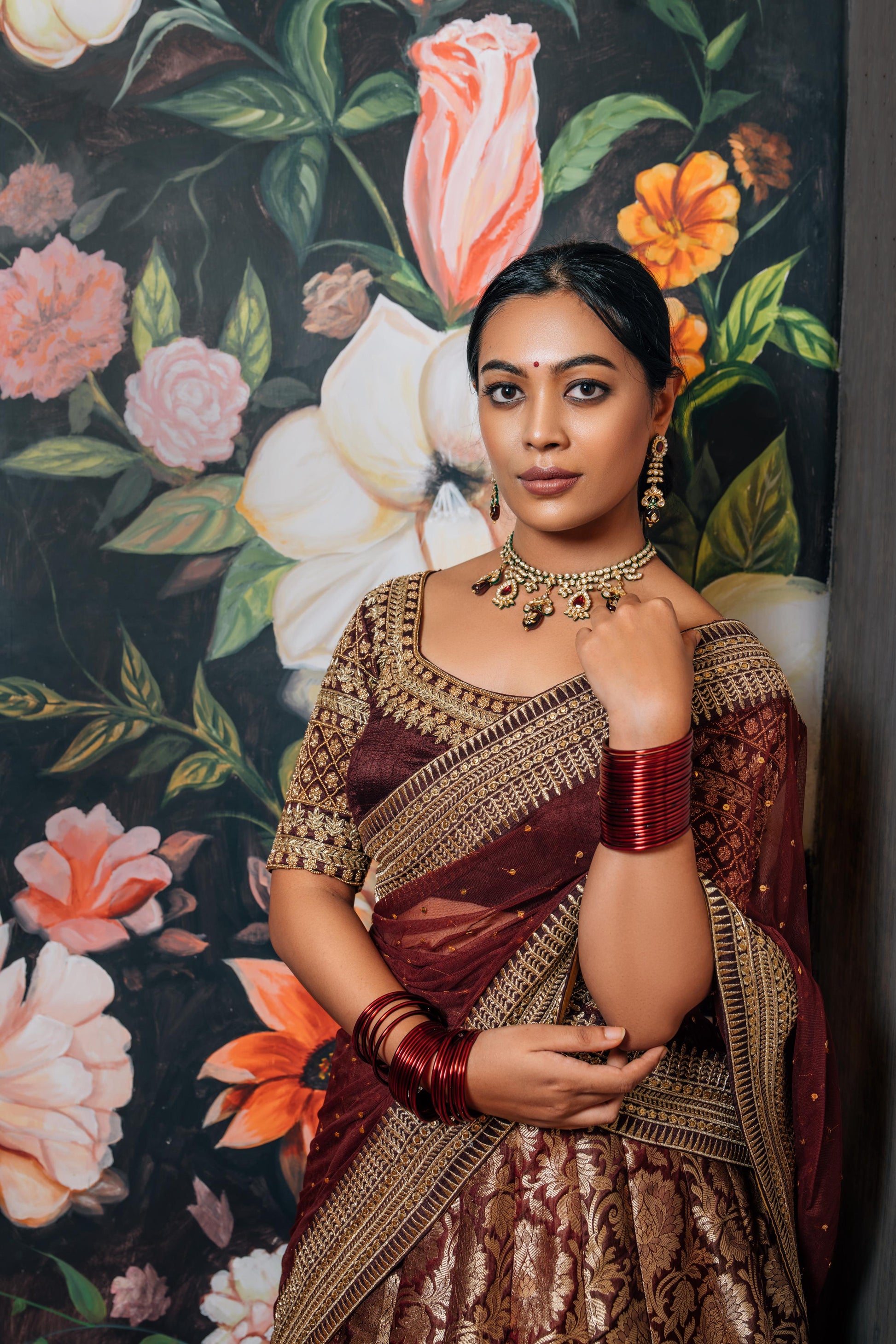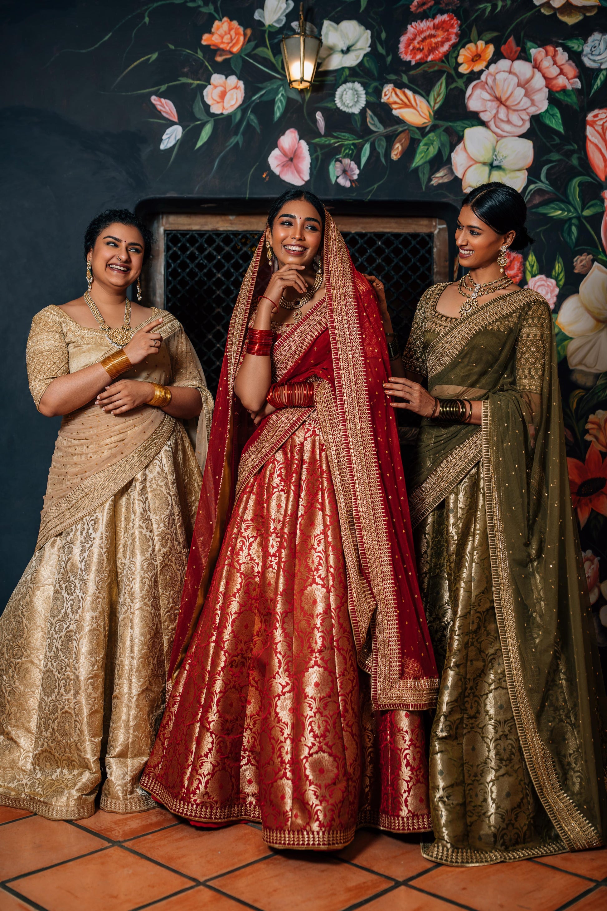 A Banarasi lehenga is just a must-have. The house staple brocade features in the skirt and is paired with a raw silk blouse. Golden trims run through all the pieces of the set, whereas intricate embroidery is featured in the blouse particularly. The sheer dupatta is laden with sequin work, and it beautifully brings the look together.
